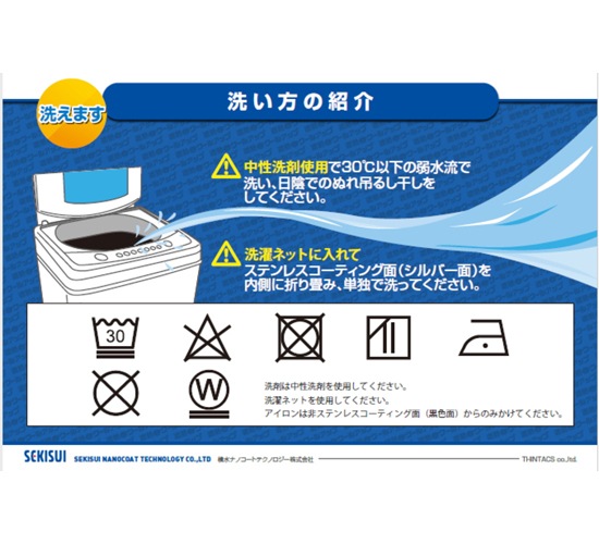 - 洗濯ネットに入れてステンレスコーティング面(シルバー面)を内側に折り畳み、単独で洗ってください。